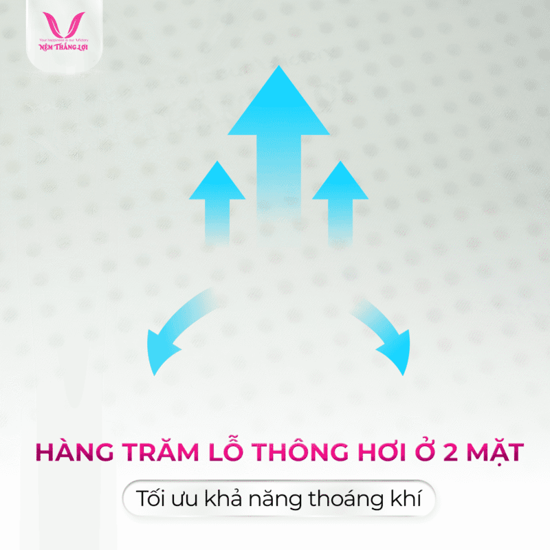 Điểm nổi bật của nệm là hệ thống hàng trăm lỗ thông hơi ở cả hai mặt, giúp tối ưu hoá khả năng thoáng khí. Hệ thống này không chỉ mang lại sự mát mẻ, dễ chịu mà còn hạn chế ẩm mốc, đảm bảo không gian ngủ luôn sạch sẽ và trong lành.